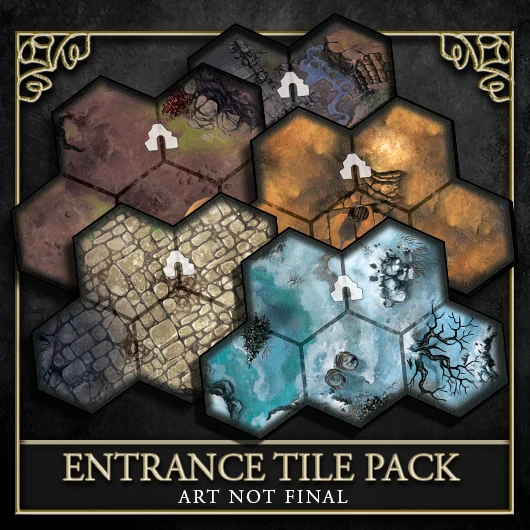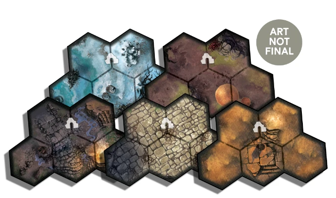 Bedenke, dass diese fünf Eingangsplättchen einzigartige Grafiken erhalten werden, die Gelände wie Wüste, Schnee, Sumpf und mehr abdecken sollen. Die hier gezeigten Plättchen sind Platzhalter-Renderings aus Photoshop und nicht unbedingt repräsentativ für das Endprodukt.