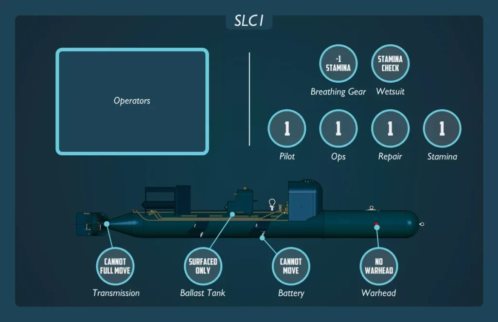 - Missionsvorbereitung – Die Spieler wählen ein Szenario, rüsten ihre Taucher aus und planen den Einsatz.