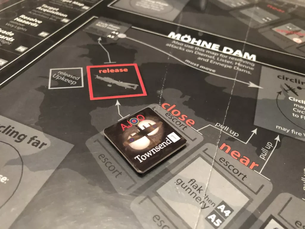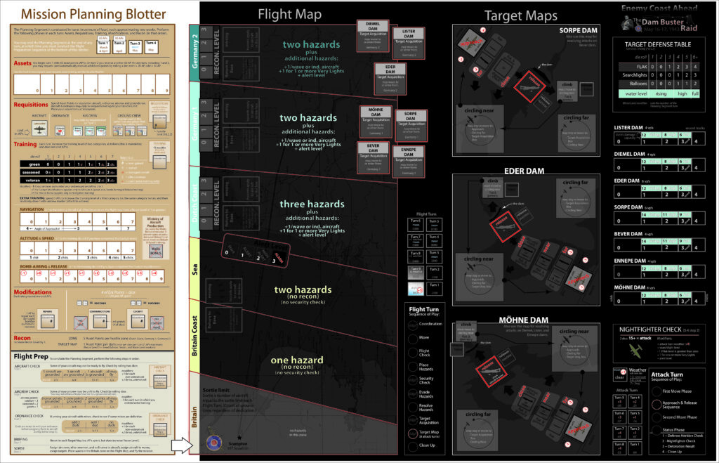 Das Spielbrett ist in drei Bereiche unterteilt: den Missionsplanungsblock, die Flugkarte (von Scampton zum Ruhrgebiet) und die Zielkarten. Die ersten Szenarien verwenden nur die Zielkarten, während größere Szenarien sowohl diese als auch die Flugkarte verwenden. Nur das Kampagnenspiel nutzt den Missionsplanungsblock in vollem Umfang, sodass Sie Ihre Staffel organisieren und trainieren, dem Bodenpersonal Aufgaben zuweisen und die Lancasters für diesen einzigartigen Angriff modifizieren können. Die Lancasters wurden für die Operation Chastise in mehrfacher Hinsicht modifiziert: