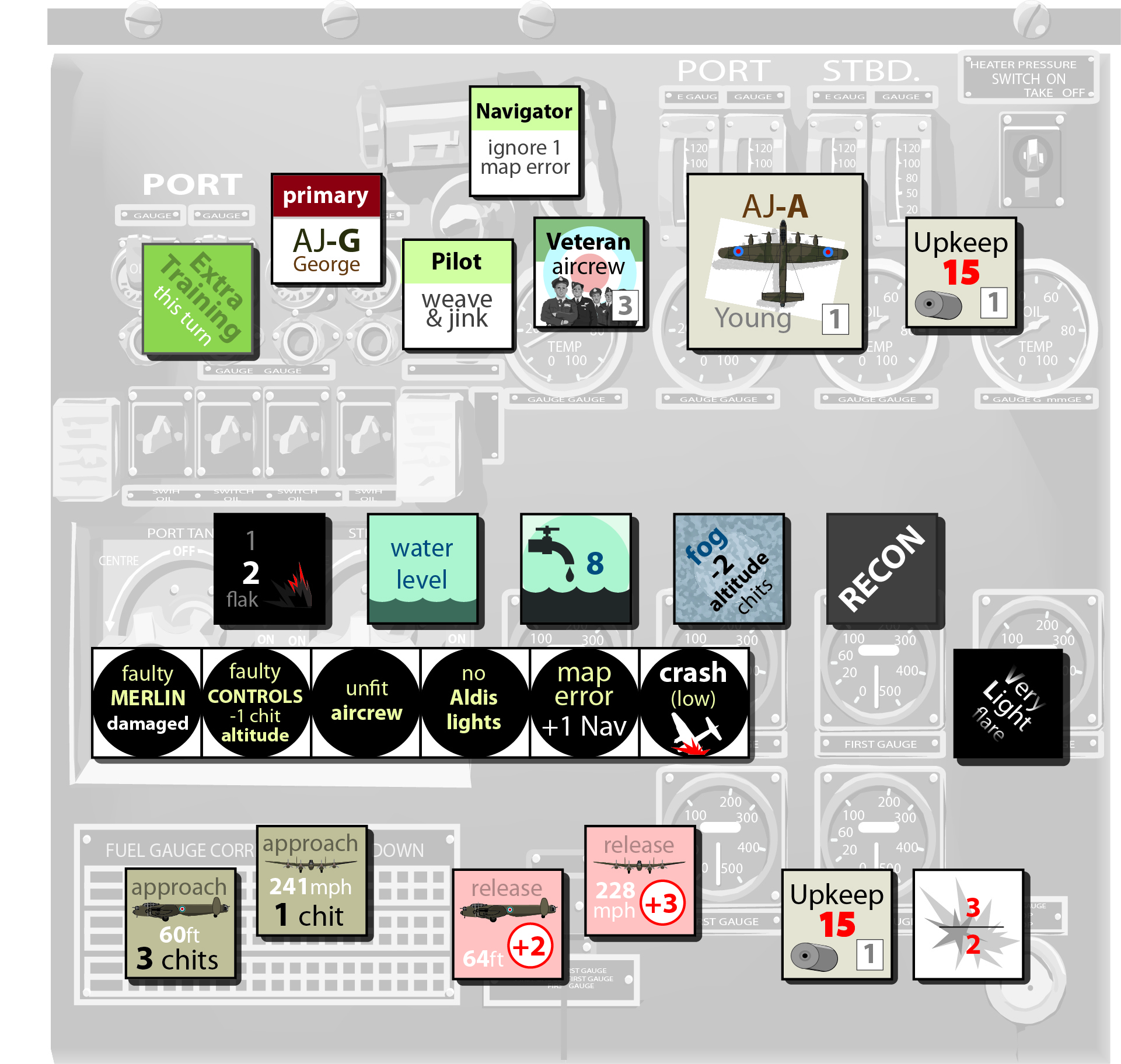 Jede Lancaster wird durch einen eigenen 1-Zoll-Spielstein dargestellt. Jeder Bomber trägt zwei oder drei 5/8-Zoll-Marker, die die Besatzung, die Waffen und möglicherweise einen Elite-Besatzungsmitglied darstellen. Alle Männer, die vor oder während des Angriffs Auszeichnungen erhalten haben, werden in diesem Spiel durch einen eigenen Marker dargestellt, der der Besatzung jeweils eine einzigartige Eigenschaft verleiht. Sogar der Hund des Geschwaderkommandanten hat seinen eigenen Marker!