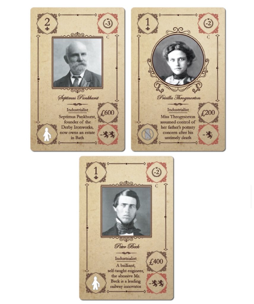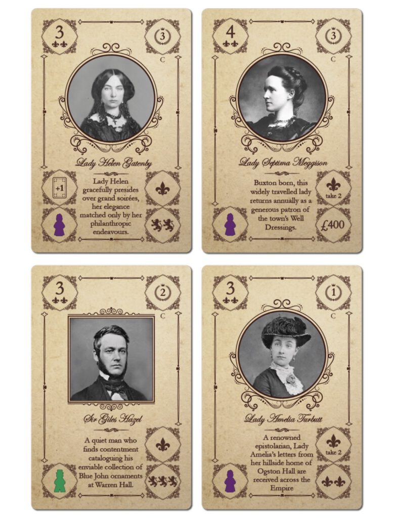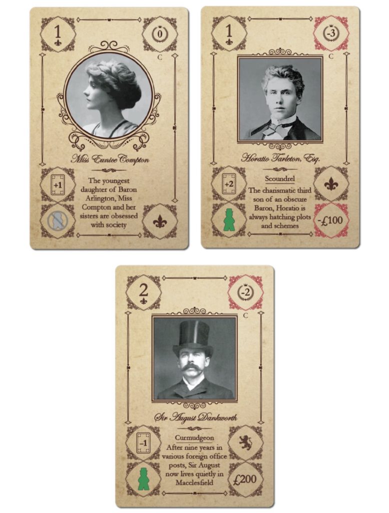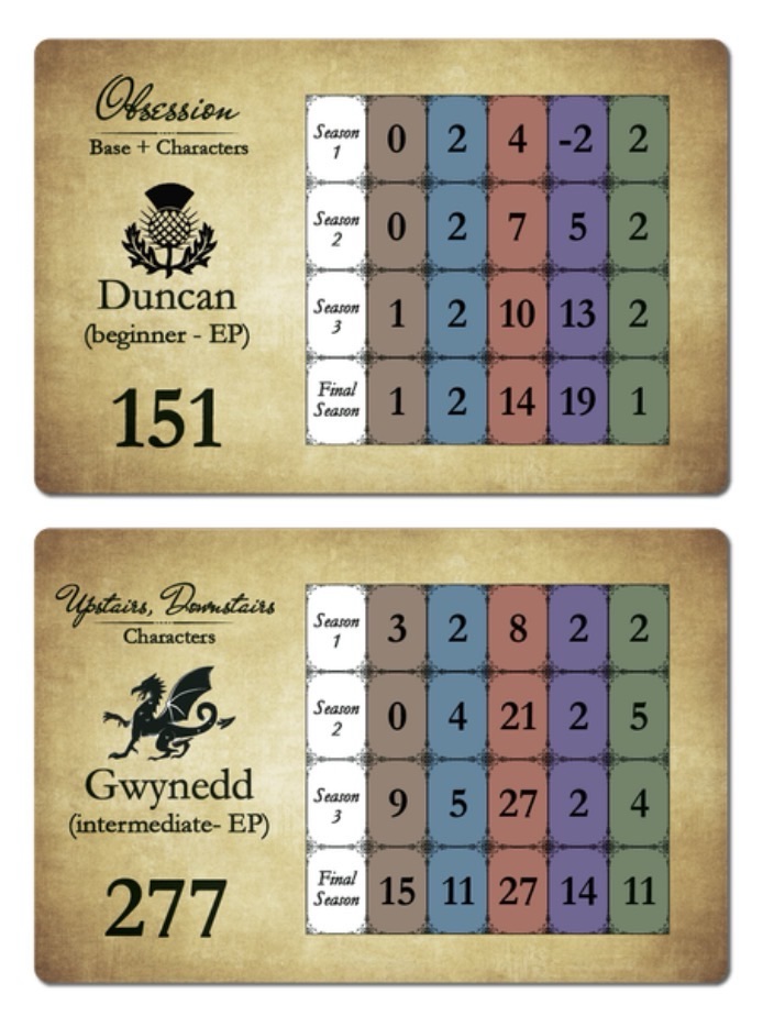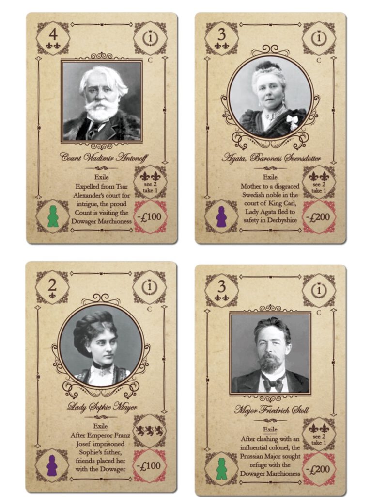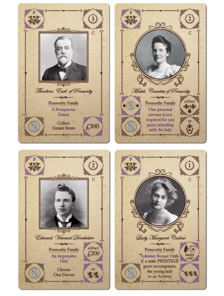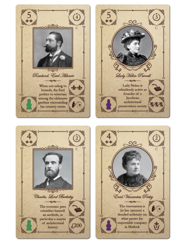 Angesehene Familien können unabhängig davon verwendet werden, ob Sie mit der Erweiterung „Characters” spielen oder nicht. Diese Box enthält angesehene Familienkarten für jede der vier Familien aus „Obsession” sowie für die Familie Wessex aus der Erweiterung „Wessex”. Die Familie Howard, die übermächtig ist, erhält keine angesehenen Familienmitglieder.