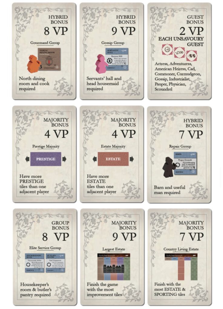 - Basis/Wessex + Upstairs, Downstairs + Sideboard, erweitertes Spiel: 1 Anfänger, 1 Fortgeschrittener, 1 Experte