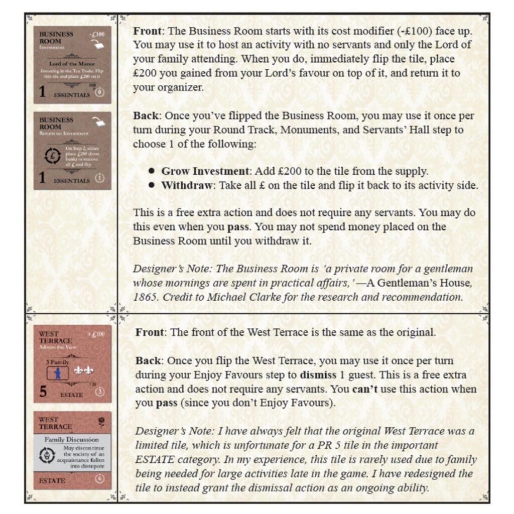 Diese Box enthält 4 Aktivitätssteine, die mit dem Basisspiel oder beliebigen Erweiterungen verwendet werden können und ursprünglich in der Useful Box (nicht mehr erhältlich) angeboten wurden. Die 2 neuen Business-Room-Kacheln können optional in den Kachelbeutel gelegt werden, während die 2 alternativen West-Terrasse-Kacheln optional die Originalversion ersetzen können. Wenn Sie sich für die Verwendung der 2 alternativen West-Terrasse-Kacheln entscheiden, entfernen Sie bitte die Originalkachel (oder beide Originalkacheln, wenn Sie Upstairs, Downstairs besitzen).