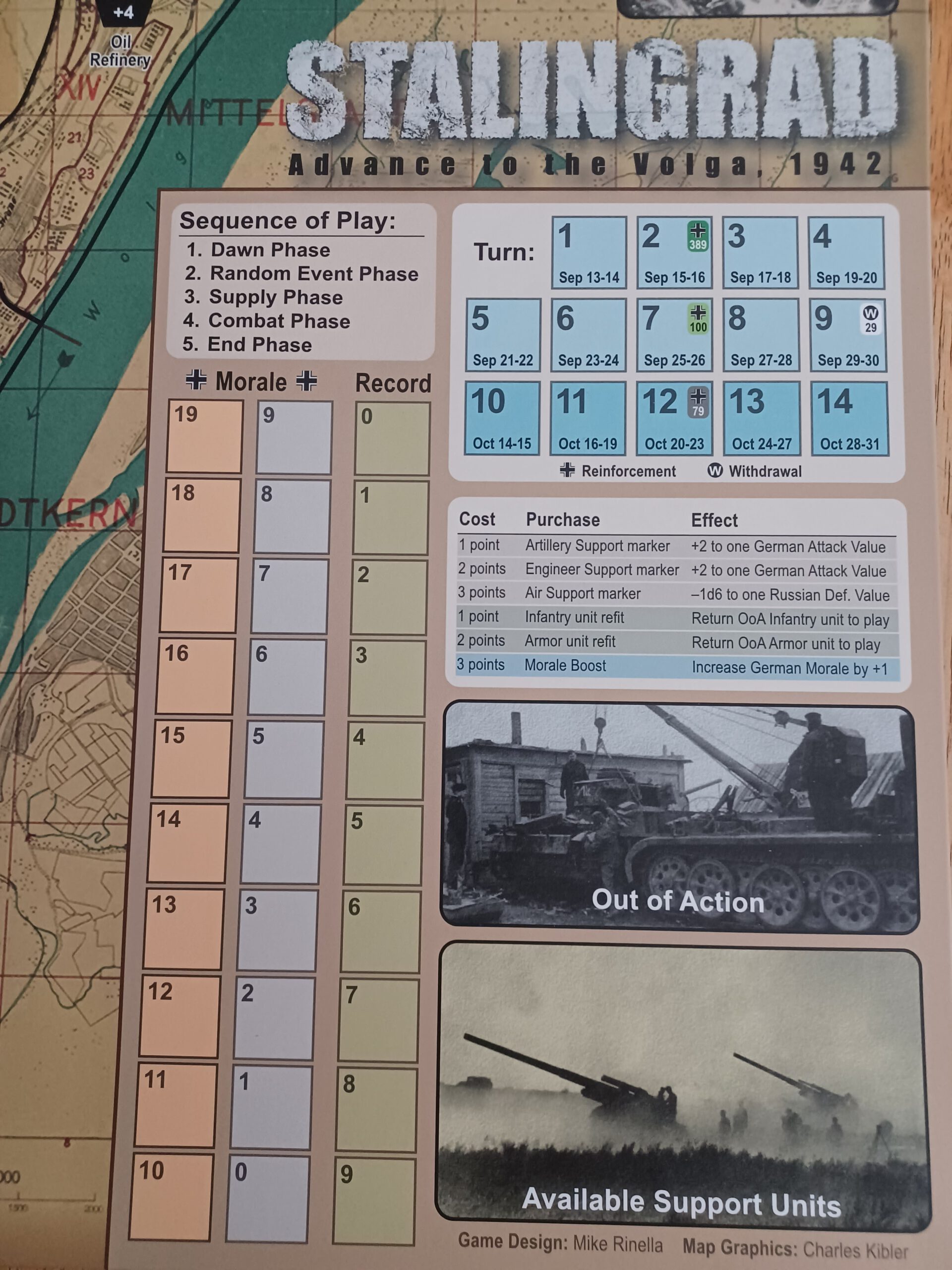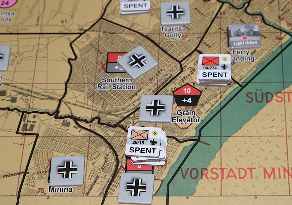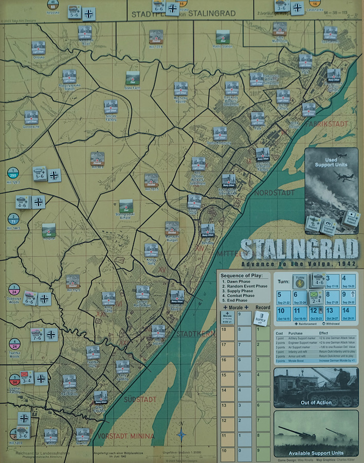 Außerdem gibt’s ein fünf Runden langes „Fabrikviertel-Szenario”, das die zweite große deutsche Offensive im Oktober 1942 zeigt. Die Herausforderung ist jetzt noch größer: Der Spieler muss ganz Stalingrad einnehmen, um rechtzeitig Divisionen freizusetzen, die die deutschen Flanken außerhalb der Stadt gegen die bevorstehende sowjetische Winteroffensive schützen, die nicht mehr weit ist. Mit einer Vorbereitungszeit von weniger als 15 Minuten, geringer Spielsteinanzahl, unendlicher Variabilität und kurzer Spieldauer spricht „Stalingrad: Advance to the Volga, 1942“ Spieler aller Erfahrungsstufen an, vom Anfänger bis zum erfahrenen Spieler.